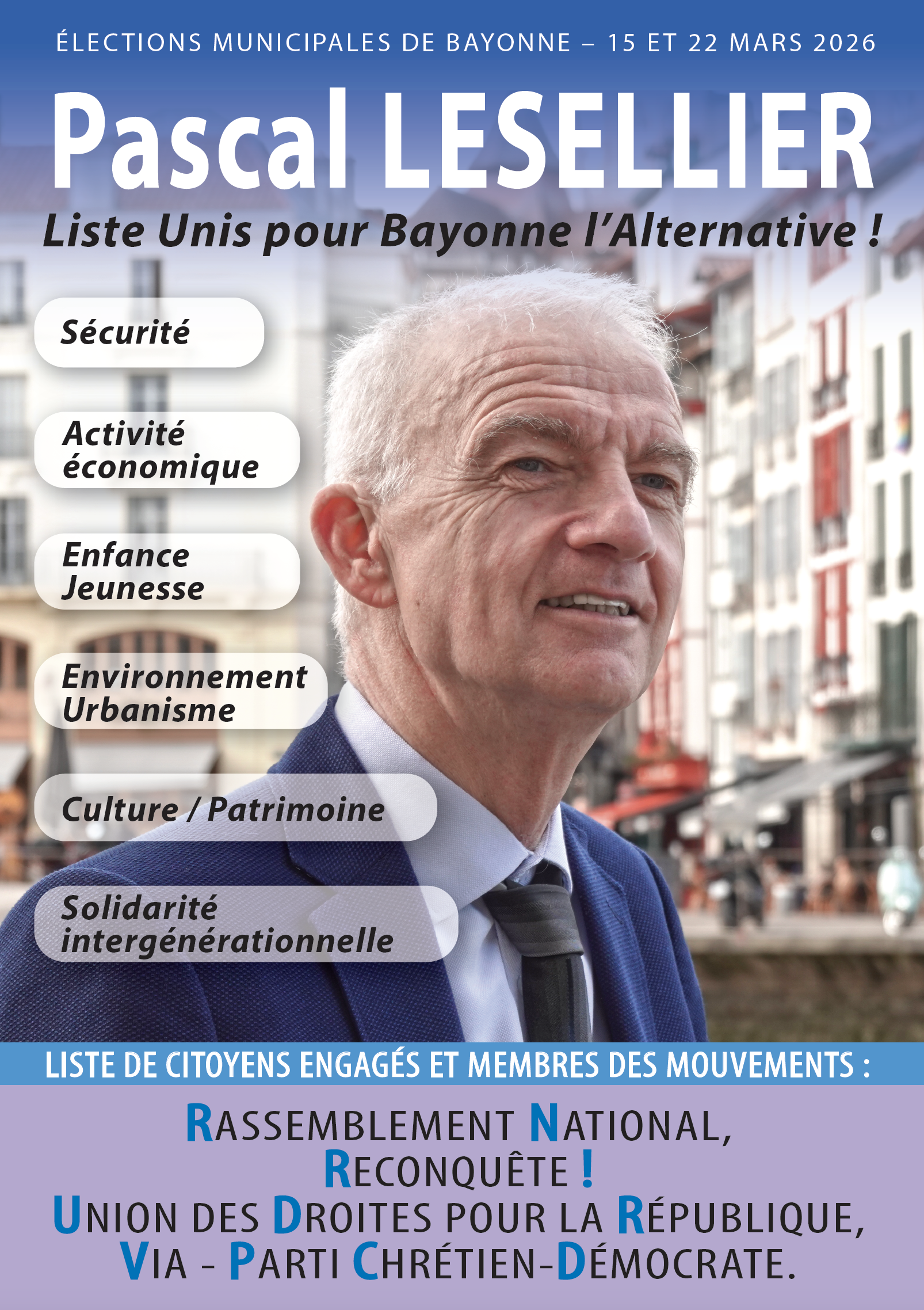 Nous avons de l'ambition pour Bayonne ; nous voulons doter Bayonne d'équipements structurants à la hauteur de l'une des villes les plus attractives de France. Nous voulons développer son économie et équiper les quartiers de bâtiments publics répondant aux besoins des familles bayonnaises. Nous voulons que Bayonne garde sa qualité de vie et son environnement privilégié. Ville de confluence, nous voulons rappeler en tant que liste patriote et souverainiste, l'attachement fondamental des Bayonnais à leurs racines basques et gasconnes et à la France. Enfin, nous voulons mieux vous protéger face à l'insécurité, en particulier au narcotrafic qui progresse comme partout en France.