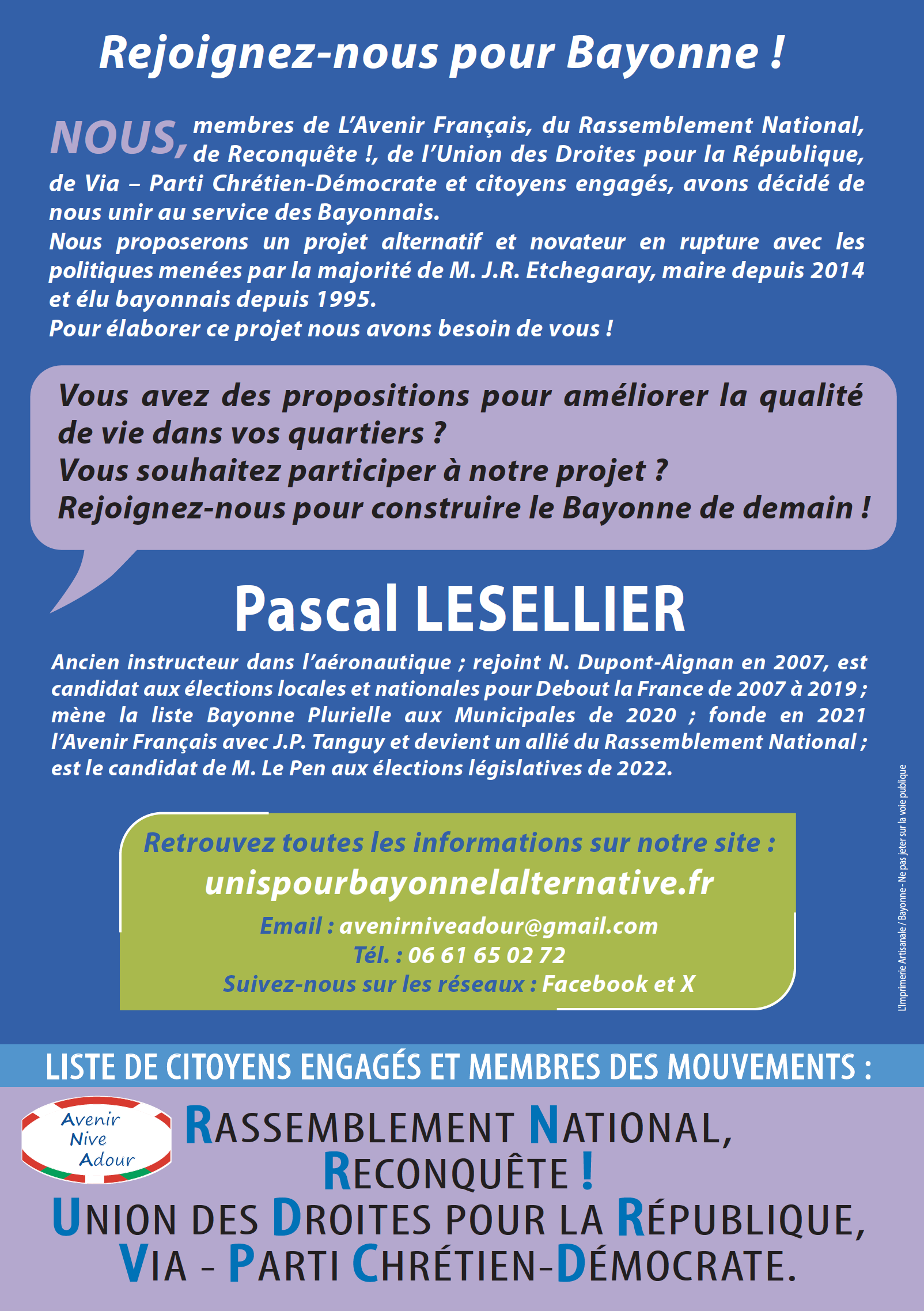 Nous, membres de L'Avenir Français, du Rassemblement National, de Reconquête !, de l'Union des Droites pour la République, de Via | Parti Chrétien-Démocrate et citoyens engagés, avons décidé de nous unir au service des Bayonnais.